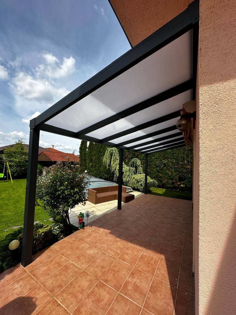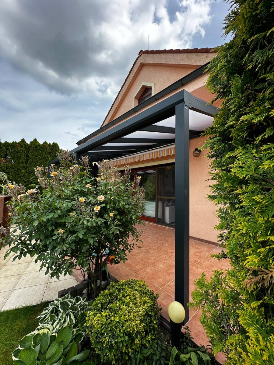 Pergola vo veľkosti 6,5 x 2,5 metra je ukotvená o doma poskytuje ochranu pred slnkom aj daž'dom. Prestrešenie je z mliečneho polykarbonátu, ktorý vytvrára príjemný tieň na terase a zároveň rovnomerne prepúšťa svetlo.